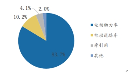 從動力用鉛蓄電池各用途占比來看,鉛酸動力電池主要運用在電動兩輪車、電 動三輪車和電動汽車領域。