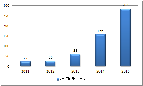 2011-2015年中國互聯(lián)網(wǎng)醫(yī)療健康領(lǐng)域融資數(shù)量