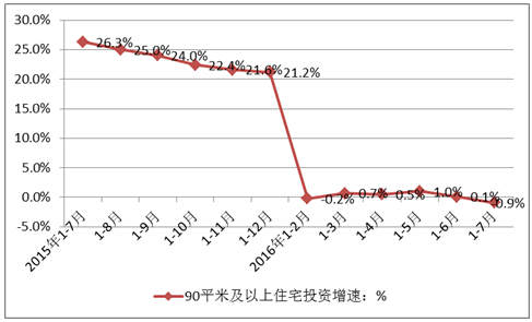數據顯示,2015年7月—2016年7月間全國90平方米以下住宅的增速在經過2015年7—12月的高速增長后,在2016年1-2月跌入負值,且1-7月的增速都不超過1%。