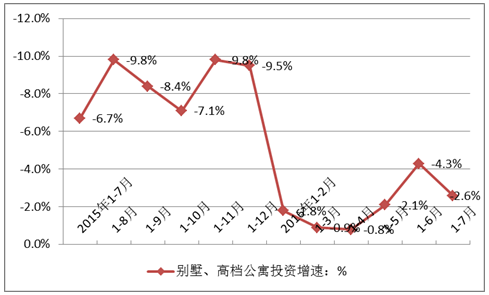 數據顯示,2015年7月—2016年7月間全國別墅、高檔公寓投資增速相比以上兩種住宅的增速要遜色許多,期間一直處于負增長。不過,在2016年1-7月增速下降有所緩和,但是形勢依然不樂觀。