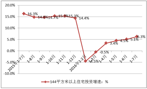 數據顯示,2015年7月—2016年7月間全國144平方米以上住宅的增速也在經過2015年7—12月的高速增長后,在2016年1-3月跌入負值,從4月份開始,增速有所回升但均不超過7%。