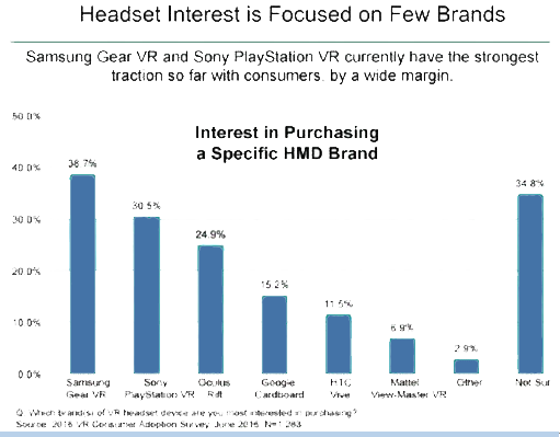 據悉,Greenlight VR在其2016年虛擬現實消費者研究報告中指出,相比于去年十月份,消費者對虛擬現實的興趣有所下降。調查同時顯示,在頂級虛擬現實設備中,消費者的首選是三星旗下的Gear VR,其次是索尼的PlayStation VR。