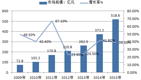2009-2015年中國IDC市場規(guī)模數(shù)據(jù)圖(億元)