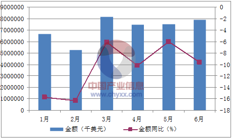 月份金額(千美元)金額同比(%)1月6683464-15.72月5267049-16.33月8146160-6.14月7472603-10.25月7532954-66月7907388-9.6數(shù)據(jù)來(lái)源:中國(guó)海關(guān),中經(jīng)先略數(shù)據(jù)中心整理