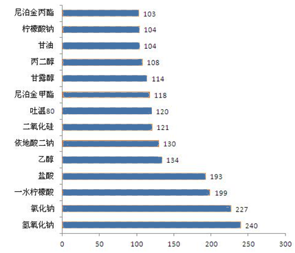在不區(qū)分給藥途徑的前提下,F(xiàn)DA批準藥品使用頻率最高的藥用輔料為氫氧化鈉,使用次數(shù)為240次,氯化鈉、一水檸檬酸分別排名第二、第三。