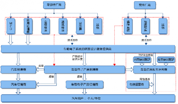 車載電子系統的研發設計服務提供商的上游主要是以半導體廠商為主的零部件廠商及基礎軟件廠商,下游為車載電子產品終端生產廠商、汽車制造商及車載信息服務運營商等,車載電子系統的研發設計服務商是連接產業鏈上下游的橋梁,是車載電子產品創新的重要推動者,為業內企業提供車載電子系統的方案設計及產業化的技術支撐。車載電子系統研發設計的技術含量較高,涉及多技術的融合,是決定車載電子產品性能的核心。