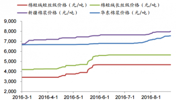 棉花價(jià)格上漲通過(guò)產(chǎn)品替代效應(yīng)帶動(dòng)粘膠短纖、溶解漿價(jià)格上漲。根據(jù)報(bào)告,2016年7月以來(lái),粘膠短纖市場(chǎng)價(jià)格不斷上漲,粘膠短纖1.5D 價(jià)格從7月1日13,480元/噸,上漲2,820元/噸,至8月24日為16,300元/噸,漲幅達(dá) 20.92%。粘膠短纖1.2D價(jià)格從7月1日13,850元/噸,上漲2,650元/噸,至8月24日為 16,500元/噸,漲幅達(dá)16.06%。截至7月末,中端廠家報(bào)價(jià)在15,700-16,000元/噸, 高端廠家報(bào)價(jià)在16,000元/噸。價(jià)格上漲的部分原因?yàn)槊藁▋r(jià)格大漲,市場(chǎng)信心增強(qiáng)。 且華北及華東地區(qū)有部分粘膠短纖廠家裝置檢修,行業(yè)開(kāi)工率為8.1成,供給有所降 低。