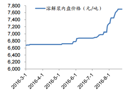 目前,下游紗企需求量大,粘膠短纖廠家的訂單量充足,訂單普遍可達(dá)8月下旬。 目前行業(yè)庫(kù)依舊處于較低水平,8月份粘膠短纖廠家?guī)齑婕s為8天,遠(yuǎn)低于行業(yè)平均 訂貨周期15天,廠家供應(yīng)緊張程度有望持續(xù)或升級(jí)。粘膠短纖價(jià)格未來(lái)有持續(xù)上漲 趨勢(shì),其或?qū)⑦M(jìn)一步帶動(dòng)溶解漿價(jià)格上漲。同時(shí),2016年以來(lái)棉短絨價(jià)格與棉漿價(jià) 格均呈現(xiàn)上漲趨勢(shì),其通過(guò)與溶解漿互為生產(chǎn)粘膠短纖原材料替代品的途徑,也為 溶解漿價(jià)格上漲提供了支撐條件。溶解漿價(jià)格上明顯,8月份國(guó)內(nèi)溶解漿廠家訂單充 足,截至8月24日溶解漿內(nèi)盤價(jià)格達(dá)7,700元/噸。