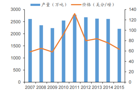2007-2015 年世界棉花產量和價格