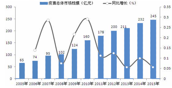 中國的疫苗市場規模小,再加上中國特有的社會和醫療因素,增長非常迅速。從2004年開始,國內人用疫苗市場以年均20%的速度增長,2005-2015年的幾年間,人用疫苗市場規模從65億元增長至245億元。由于二類疫苗價格的不斷增長,且二類疫苗價格較高,導致2015年我國疫苗市場銷售規模在批簽發量下降的情況下仍實現了5.60%的增長,總體銷售規模約為245億元。