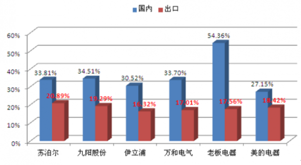 我國廚房小家電企業可劃分為出口型和內銷型兩類,出口產品利潤率水平相對較低。相比之下,專注國內市場的小家電企業,不僅分享了國內廚房電器市場的快速增長,而且通過自主品牌運營和營銷渠道建設,具有了一定的議價能力,經營狀況和利潤水平普遍好于出口型企業,同類產品在國內市場銷售的價格和利潤率普遍高于出口。
