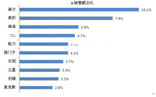 上半年大家電的品牌集中度再次提升,銷量前十品牌分別是海爾、美的、海信、TCL、格力、西門子、樂視、三星、創(chuàng)維和奧斯克,十大品牌市場總份額提高到49.1%,同比提高4個百分點。其中,海爾、美的、海信、TCL連續(xù)兩年穩(wěn)居大家電線上TOP4。