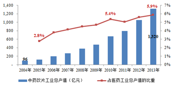 自2004年以來,中藥飲片行業(yè)一直保持強勁增長勢頭。2009年中藥飲片被列入國家基本藥物目錄,進一步推動了中藥飲片行業(yè)發(fā)展,工業(yè)總產(chǎn)值從2004年的96.43億元增至2013年的1,319.76億元,年均復合增長率達33.74%,增長速度明顯高于醫(yī)藥工業(yè)整體增速。中藥飲片在醫(yī)藥行業(yè)中的占比呈現(xiàn)逐年遞增趨勢,成為發(fā)展最為快速的醫(yī)藥子行業(yè)。