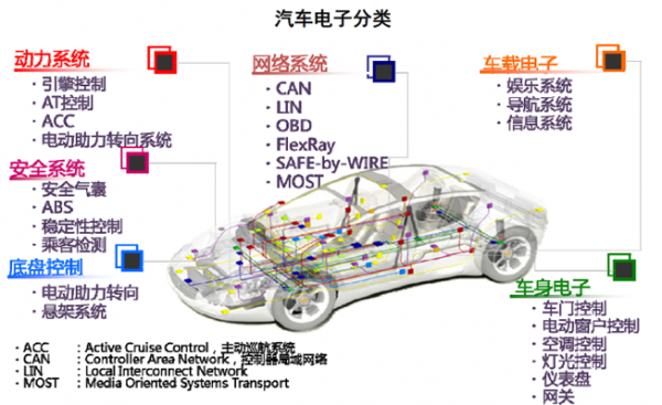 汽車電子按功能和用途分為汽車動力系統、汽車底盤控制及安全系統、車身電子和車載電子四類。