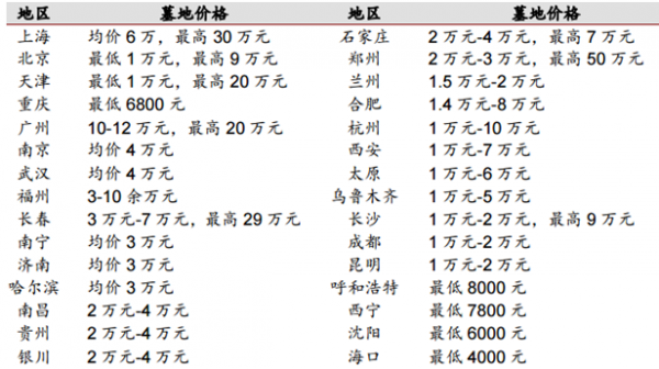 政策趨嚴導致現存合法合規的經營性公墓成為稀缺資源,尤其是規劃良好、服務周全的公墓更是高度稀缺,這直接導致市場價格不斷提升,議價能力逐步走強。根據對全國部分城市墓地價格的不完全統計,我們可以看到墓地價格不輸當地房價,甚至有很多地方墓地均價遠高于房價。