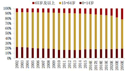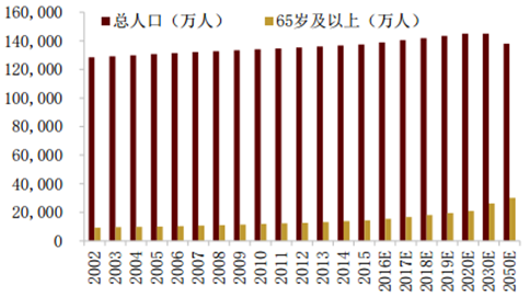 我國的人口結(jié)構(gòu)呈現(xiàn)老齡化 不斷上升的趨勢(shì)。2002 年,我國 65 歲及以上人口共有 9377 萬人,老齡化人口占總?cè)?口比率約為7.3%,而到2015年,老齡人口增長至1.44億人,老齡化水平上升至10.5%。 未來我國老齡化水平將會(huì)持續(xù)上升,預(yù)計(jì)到 2020 年將達(dá)到 14.5%,老齡人口將突破 2 億人,2050 年老齡化水平預(yù)計(jì)增長至 21.8%,老齡人口突破 3 億人。