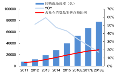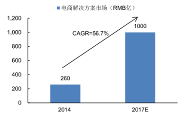 2014年品牌電商服務市場規模260億,預計2017年將達到1000億(復合增速56.7%),而行業龍頭受益于集中度提升紅利,有望實現更高的復合增速。