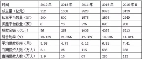 2016年上半年,我國P2P信貸行業的成交量是8423億元,運營平臺數量達到2349家,問題平臺數量達到268家;行業貸款余額是6213億元,綜合利率達到11.31%。