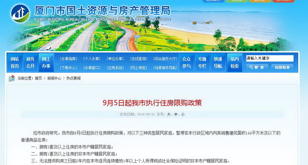 核心提示:廈門市國土資源與房產(chǎn)管理局相關(guān)截圖 據(jù)廈門市國土資源與房產(chǎn)管理局消息,經(jīng)市政府研究,我市自9月5日起執(zhí)行住房限購政策,對以下三種類型居民家庭,暫停在本行政區(qū)域內(nèi)向其銷