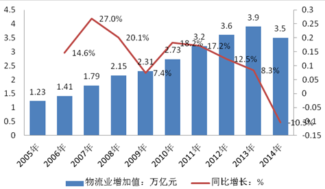 2014年,我國物流業增加值3.5萬億元,可比增長9.5%,保持較快增長,其中,交通運輸業增加值2.4萬億元,可比增長8.3%,貿易物流業增加值6781億元,可比增長7.9%,倉儲業和郵政物流業增加值分別增長4.8%和35.6%。