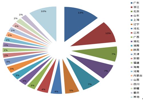 2015年全國展覽館數量省份比例(單位:%)