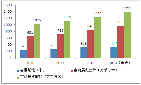 2010-2013年中國會展場館數量及面積