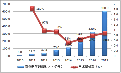 茅臺(tái)、五糧液、瀘州、洋河等酒企巨頭或“自建門戶”或?qū)で蠛献鳎e極開辟電商領(lǐng)域;酒仙網(wǎng)、酒美網(wǎng)、1919、中酒網(wǎng)等酒水電商平臺(tái)備受資本推崇,酒類B2C交易額逐年大幅上升。2016-2017年酒類電商行業(yè)銷售收入預(yù)測