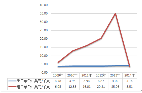 2009-2014年我國(guó)撲熱息痛進(jìn)出口價(jià)格走勢(shì)圖