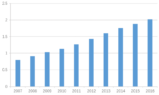 2007-2016年中國城鎮居民年度人均可支配收入(萬)