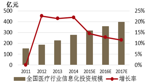 中國的醫療信息化發展時間較短,信息化覆蓋程度 不夠,特別是高集成度、高共享度的信息化解決方案。由于醫療信息 化行業會在下文進行詳細的研究,這里就不再贅述,未來中國醫療行業的信息化行業市場規模仍會持續增加,2017 年會接近 400 億市場規模。