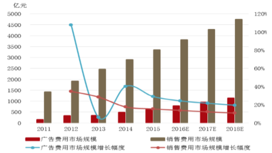 2015 年藥企廣告投入和銷售投入的市場規模超過 4000 億,到 2018年預計會超過 5500 億。同時 2014 年醫藥流通行業的市場規 模為 1.24 萬億。