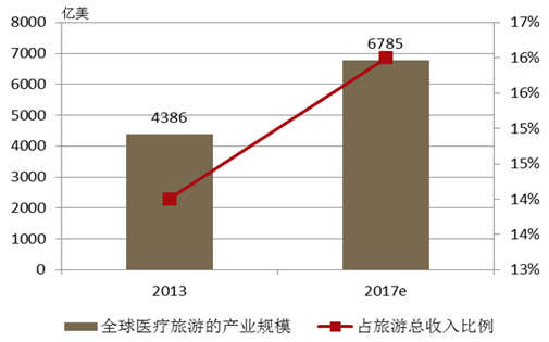日、韓、美依托各自優勢成為中國最大海外醫療旅游目的地。美國和日本因其系統性的先進技術,強大的藥 物和成熟的海外患者服務體系,成為患者走出去治病的首選目的地。 根據斯坦福研究機構(SRI)報告,預計 2017 年全球旅游的收入規模 將達到 6785 億美元,而 2013 年該收入為 4386 億美元,全球醫療旅 游增速是旅游業增速的兩倍,預計 2017 年全球醫療旅游的收入將占 世界旅游總收入的 16%,2013 年該比例為 13%。