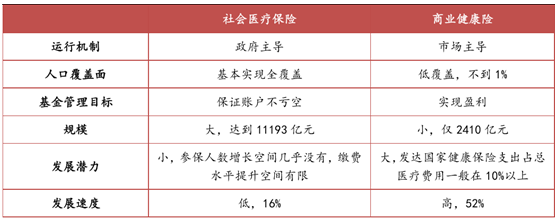 商業健康險有望在醫療費用支付方方面發揮更大的作用。基于商 業健康險與社會醫療保險在運行機制、人口覆蓋面、基金管理目標、 規模、發展潛力和發展速度等方面的對比,商業健康險具有比較優勢。商業健康險的運行由市場主導, 以盈利為目的,其對醫療費用支出的監控動力必然高于政府 主導下、以保證賬戶不虧空為目標的社會醫保。商業健康險人口覆蓋率尚 低,覆蓋人口不到 1%,保費規模尚小,對標發達國家一般水 平—占醫療總費用 10%,仍有巨大的發展空間,而社會醫保 早已基本實現全覆蓋,基金規模增加只能依托人均繳費提 升,這勢必增加政府財政壓力,增長空間有限。在政策和市場的推動下,商業健康險 每年保持 50%左右的高速增長,其在醫療費用支付方面發揮 越來越大的作用。