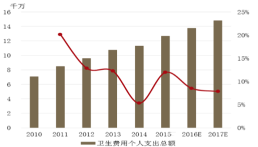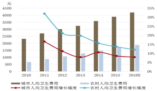 從個人衛生費用支出總額來看,2014 年已經超過 1 萬億,預計到 2017 年,個人衛生消費支出總額將會超過 1.5 萬億。而從人均數據來 看,2014 年城市人均衛生支出為 3576 元,農村人均衛生支出為 1473 元,預計到 2016 年,城市人均衛生支出達到為 4187 元,農村人均衛 生支出為 1875 元。