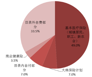 醫療費用 的支付方由社會醫療保險(包括基本醫療保險、社會醫療救濟等)、 商業保險和個人三部分構成。其中基本醫療保險占醫療總費用 56%, 包括城鎮職工醫療保險、城鎮居民醫療保險和新型農村合作醫療保 險,提供門診、住院和大病等方面的醫療保障。個人自付承擔較重,占醫療總費用的 40%,主要來自于基本醫 保報銷目錄外自費部分和基本醫保報銷目錄內自付部分。