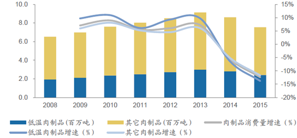 2008-2015年中國肉制品消費(fèi)量及增速