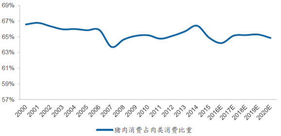 預(yù)計未來5年豬肉消費(fèi)占肉類消費(fèi)比重仍將維持在65%附近波動