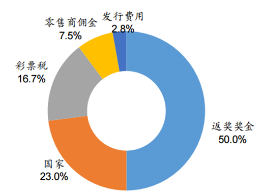 銷售收入分配:彩票銷售額的50%用于返獎,23%上交給政府,政府根據法律 規定將部分收入投入到體育、藝術、環保或青少年等項目中;16.7%用于繳納彩票 稅,7.5%是零售商的傭金;剩余2.8%則是彩票組織管理及運營費用。