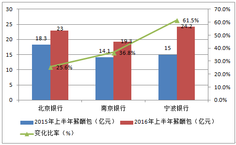 除上述6家銀行外,其他銀行上半年薪酬包均較去年同期有所增長。其中寧波、南京、北京3家城商行的薪酬包增速讓人艷羨,同比分別增加61%、37%、26%。中信、浦發兩家股份行的薪酬包也分別有10%以上的增幅。