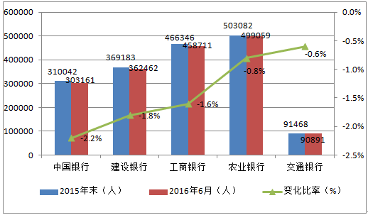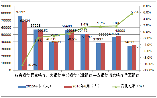 其余9家銀行全部有員工減少現象。其中工農中建四大行及招行分別較年初減員7635人、4023人、6881人、6721人和7768人,招行減員比例約10%。