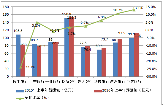 從上半年整體“薪酬包”來看,包括工行、農行、建行在內的3家國有大行以及興業、平安、民生3家股份行均較去年上半年出現下滑,6家銀行中,除民生銀行外,其他5家銀行下滑幅度不大。只有民生銀行上半年整體“薪酬包”被生生砍去近1/4,值得注意。