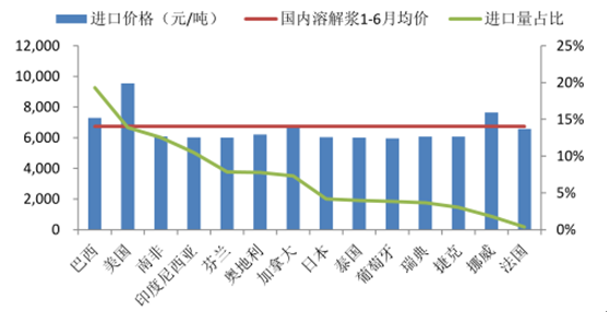 2016 年1-6 月溶解漿進口價格與國內溶解漿價格比較