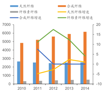 截至2014年,世界纖維實際需求量達9,197萬噸。其中,天然纖維、合成纖維和纖維素纖維需求量分別為2544萬噸、6152萬噸和501.2萬噸。合成纖維、天然纖維以及纖維素纖維2014年的需求占比分別為67%、28%以及5%。2010 至2014 年,纖維素纖維的增速為三者中最高,保持在5%-15% 之間,合成纖維以及天然纖維的增速較低,2012年以后基本保持在3%左右。以棉花為代表的天然纖維受自然因素的影響,近年來產量上升空間小,占比下降。纖維素纖維快速增長,其在三類纖維中的占比將不斷擴大,從而壓縮合成纖維在總需求中的占比。