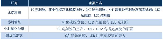 目前,我國光刻膠的主要廠商為北京科華和蘇州瑞紅。瑞紅是蘇州電子材料集團和日本 Zeon 公司及丸紅公司于 1993 年成立的合資公司。兩家公司技術儲備比較相似,但產品側重點不同。科華的光刻膠產品主要包括 IC 光刻膠、配套 試劑和平板顯示光刻膠。