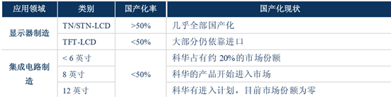 目前,平板顯示光刻膠的國產化比率較高,集成電路光刻膠的國產化比率較低。2011 年,國內半導體光刻膠及配套試劑的市場規模達到 23.2 億元,但光刻膠的國產化比率僅為 11.7%。科華在 6 英寸以下晶圓制造的光刻膠占有的市 場份額較高,約為 20%;在 8 英寸晶圓制造領域,科華的產品開始進入市場;而在目前產能缺口最大的 12 英寸的 晶圓制造領域,科華目前還沒有推出產品,但正在進行推廣,目標客戶為中芯國際。