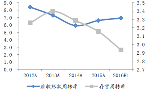運動休閑業(yè)歷年應收賬款、存貨周轉率(次)
