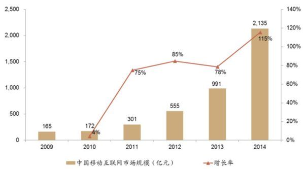 隨著移動終端的普及和網民規模的擴大,移動互聯網行業具備了快速發展的基礎條件。目前而言,最為常用的移動互聯網服務包括短信、彩信、WAP、手機音樂、手機游戲等。艾瑞咨詢數據顯示,得益于以手機應用終端開發為核心的移動互聯網產業鏈的初步構成,近年來移動互聯網市場規模擴張明顯。2009 年移動互聯網市場規模為 165.4億元,2015 年該市場規模已達到 4,300 億元,預計到 2017 年移動互聯網市場規模將突破 1 萬億元大關。