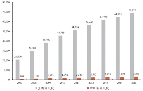 截至 2015 年末,四川省網民數增至 3,260 萬人,較 2014 年增加 238 萬人,增長率為 7.9%。2007-2015 年間四川省網民規模復合增長率為 19.0%。