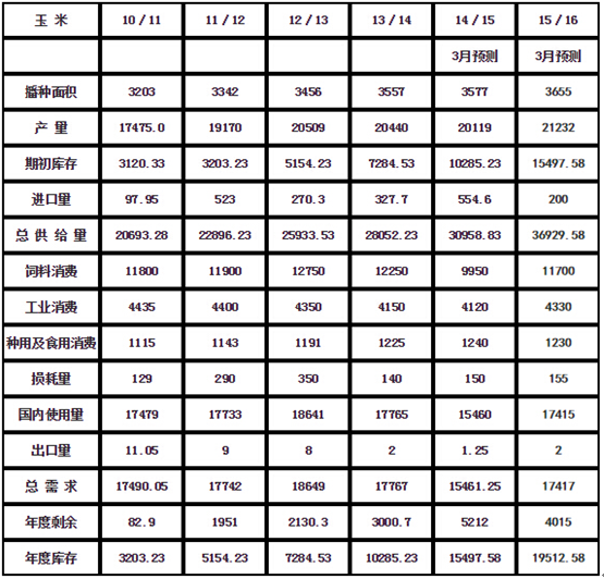 中國歷年玉米供需平衡表 單位(萬公頃、萬噸)