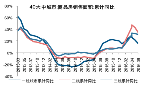 2016H1 各線城市商品房累計銷售增速分別為 17%、35%、31%